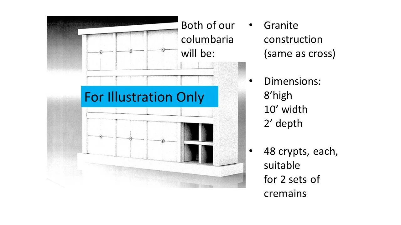 A columbarium is a wall-like structure that houses crypts for cremains and, as such, serves as the final resting place for those who are interred there. Our plan is for, eventually, two columbaria - each one will have 48 niches, holding up to 2 cremains, each